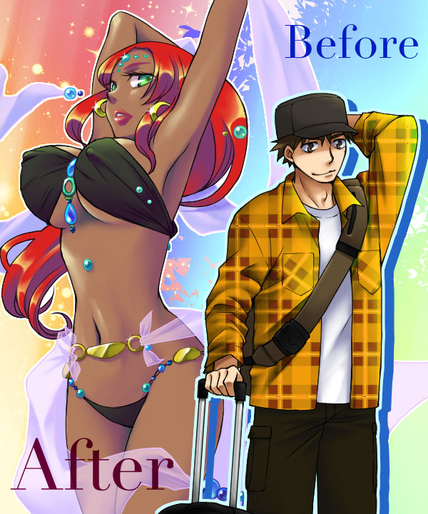 旅行が趣味の青年。ある国で踊り子(褐色、グラマラス、超爆乳)と肉体を入れ替えられてしまう。