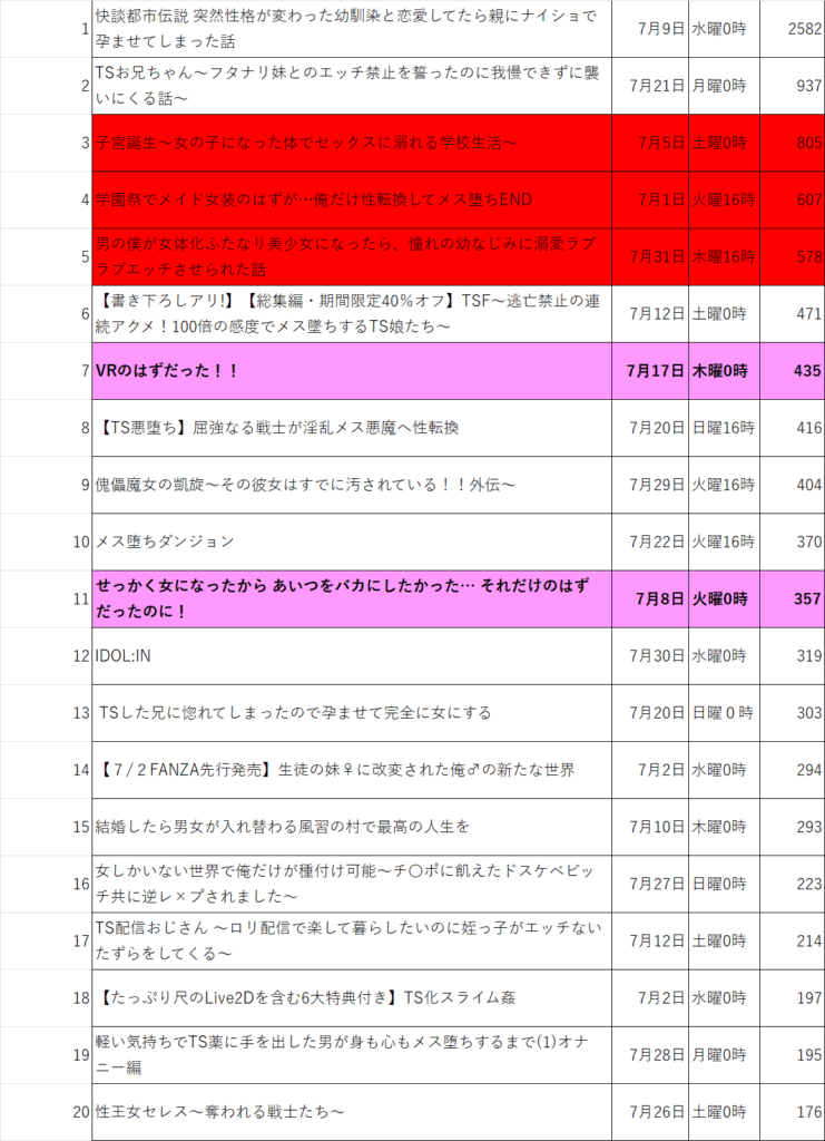 【速報】2025年7月 発売初日に売れたTSF電子同人ランキングベスト20