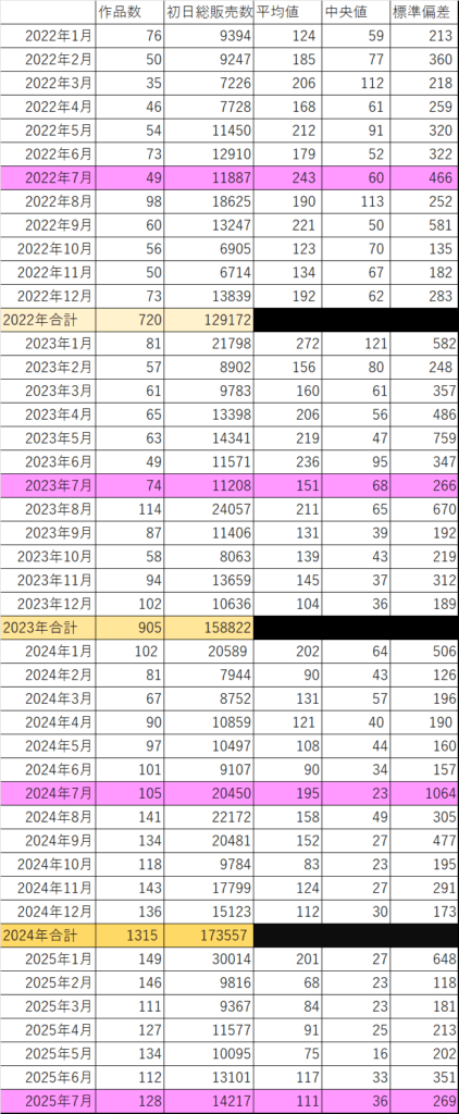 初日総販売数合計は、1か月の間に発売された電子同人すべての「初日販売数」の合計である!