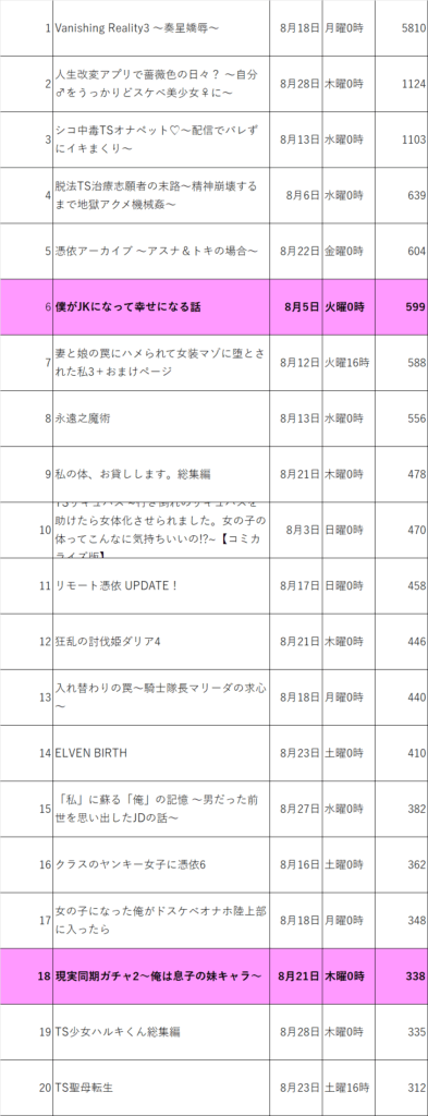 昨今一般作品等でTSジャンルが取り扱われることが増え、すそ野が広がったかと考えることもありましたが、今月のように1強の作品によって引っ張られているということを見ると、まだまだニッチなジャンルなのではないかと考えざるを得ません。