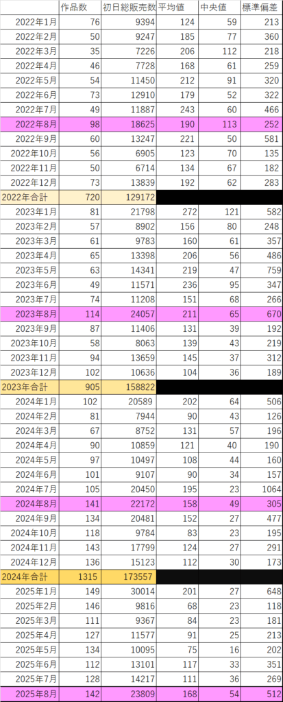 初日総販売数合計は、1か月の間に発売された電子同人すべての「初日販売数」の合計で ...