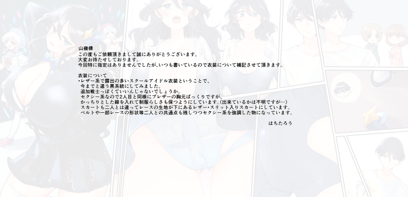 TS後 背が高めの目を見張るほど胸が大きい美少女アイドルにTSする。前に描いていただいた2人とは雰囲気が変わって、エナメル調で露出面積が多いセクシー系なスクールアイドル衣装を着ている。拾った髪飾りが衣装に取り入れられている形で。(はちたろうさんは資料で確認済です。) (内容) 前に書いていただいたものと同様、胸が膨らむ等の性転換過程をじっくりお好きなように描いていただきたいです。最後のコマは以前の照れていた2人とは違い、自信満々に自分のエッチなプロポーションを見せつけるような感じでお願いします。(過去に描いてくださったTSアイドルがゲスト出演していると嬉しいです。)