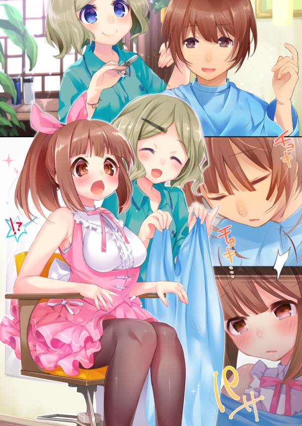 『新しく出来た美容院にやってきた主人公(髪の毛は耳ぐらいまで伸びてる)、店員(女性)のオススメお任せで注文し、いつの間にか寝てしまい。起きたらポニーテール(髪の毛は肩ぐらいの長さになっている)の美少女になっており、店員から笑顔で「よくお似合いですよー、それと服装はサービスでーす!」と言われ驚愕する主人公。』