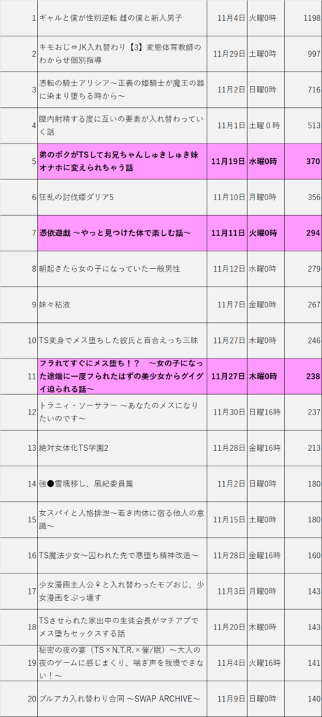 【速報】2025年11月 発売初日に売れたTSF電子同人ランキングベスト20