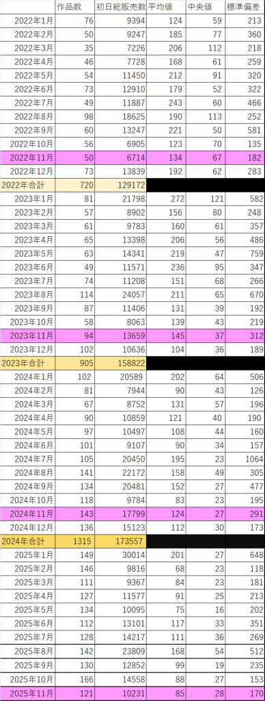初日総販売数合計は、1か月の間に発売された電子同人すべての「初日販売数」の合計で ...