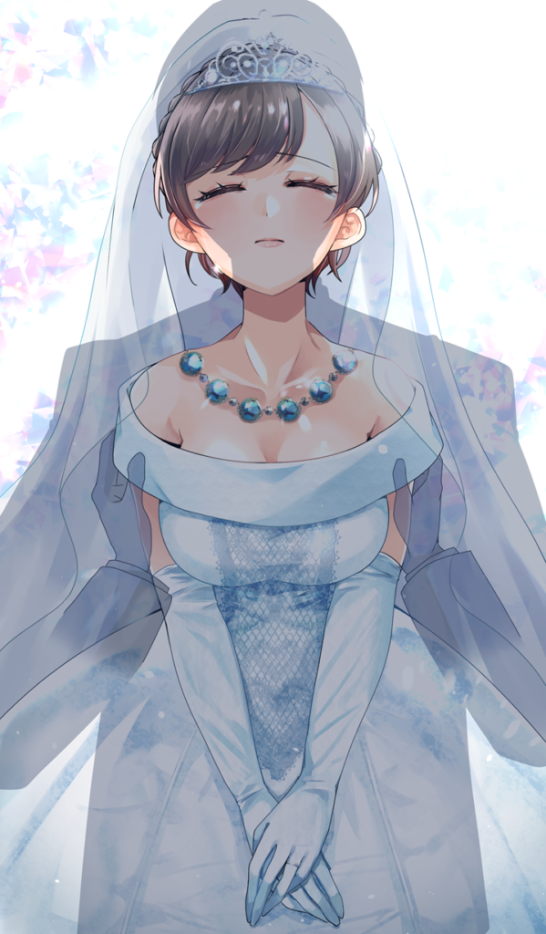 以前に描いていただいた「大鷹と貫井の結婚式+初夜」の大鷹の初夜イラストにおける大鷹のブライダルインナー(ウェディングランジェリー)に更にお揃いのストラップレスブラと紐パン(Tバック)を着用した、初夜を迎える直前の大鷹と描いてほしいです。可能ならばブラと紐パンにピコゴムを、そして紐パン、ブラ、ウェストニッパーにガーターベルトと同じタレ付きリボンを装飾として描いていただければと思います。下着の柄は紐パンのクロッチ以外は以前に描いていただいたウェストニッパーとお揃いで描いてほしいです。下着のすけ具合も以前に描いていただいた「大鷹と貫井の結婚式+初夜」のイラストにおける下着と同じくらいでお願いします。チアガール編のイラストNo.4と同じく貫井の視点で貫井に鏡の前に大鷹は立たされていますが、今回は両方の二の腕を貫井に掴まれ、若干足を内側に閉じていますが、完全に足を閉じておらず、片方の手を口元近くに添えながら驚愕しつつ、気持ちは避けられない初夜に絶望感と羞恥心が抑えられずに顔を赤く染めて震えながら鏡に写った自分の姿を凝視している大鷹を描いてほしいです。そして、可能ならば口元近くに添えた手でブラなどの下着や顔が隠れないように描き、Tバックの紐パン(ブライダルショーツ)を着用した大鷹のヒップを空いたスペースに描いていただければと思います。全身、膝から上、または太ももから上を描くか、はちたろう様の判断にお任せします。
