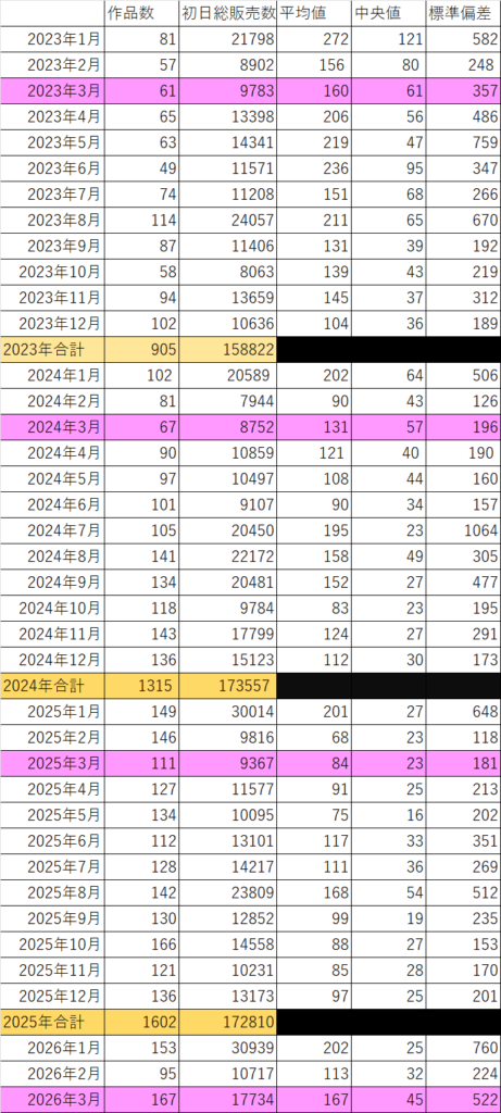 初日総販売数合計は、1か月の間に発売された電子同人すべての「初日販売数」の合計で ...