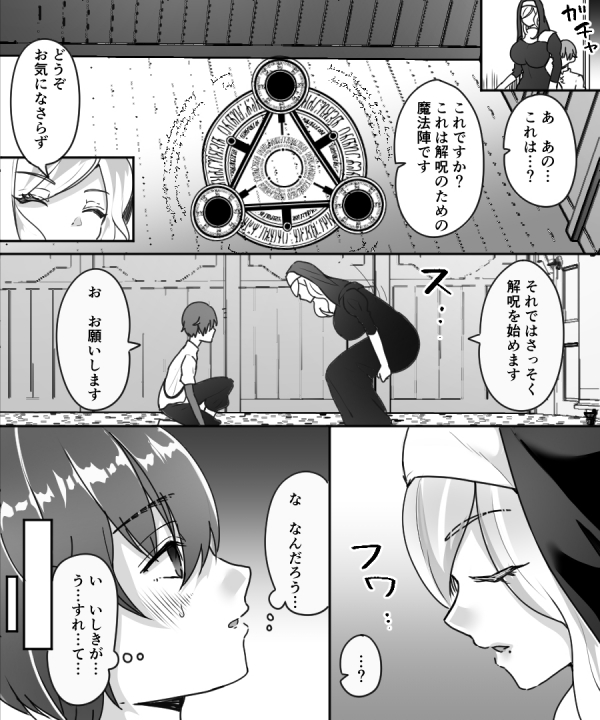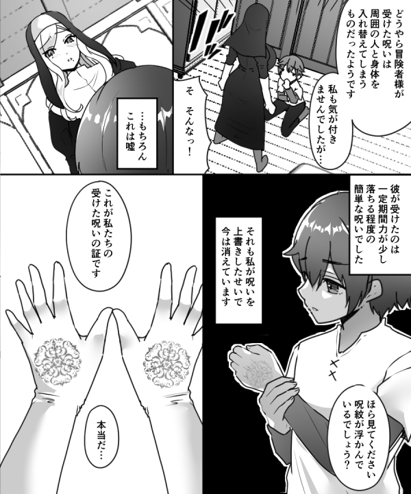 「自身の性欲に困っていたシスターさんが、たまたま解呪に訪れたショタの冒険者に入れ替わりの呪いをふっかける。元シスターは冒険者の身体をエンジョイしている一方で、元冒険者は淫乱なシスターの身体に耐えることができず……。